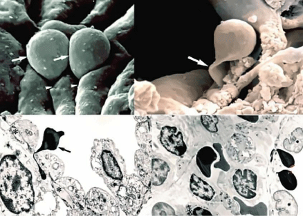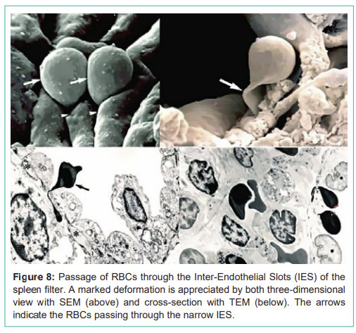 Figure 8: Passage of RBCs through the Inter-Endothelial Slots (IES) of the spleen filter. A marked deformation is appreciated by both three-dimensional view with SEM (above) and cross-section with TEM (below). The arrows indicate the RBCs passing through the narrow IES.