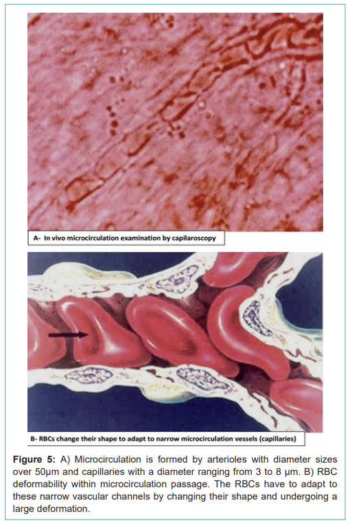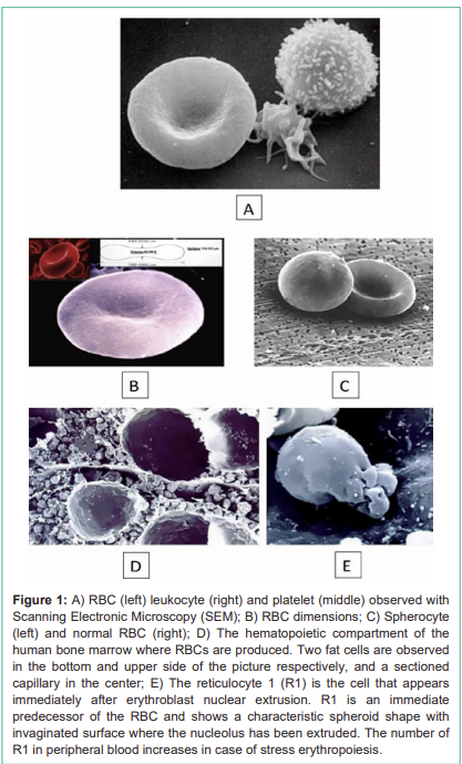 This is not a static situation, and the shape of circulating RBCs changes permanently in normal conditions and different pathologies, facilitating the diagnosis. For many years, Scanning Electronic Microscopy (SEM) has been a useful complementary tool for exploring RBC shape because a three-dimensional image has allowed the reinterpretation of the conventional morphology observation of RBCs by MGG stained blood smears, where are seen as squashed or flattened cells on extension [2]. Due to this, SEM has allowed evaluating the real RBC shape in different pathological conditions as can be demonstrated in Hereditary Spherocytosis (HS) where RBCs are spherical (Figure 1c). This very distinctive shape of RBCs is the best demonstration that, as in many other life situations, form and function are here, inseparable elements. In the human organism, cells have perfectly adapted their shapes to perform their function in the most efficient and optimum way. Due to its discoid shape RBCs are an example of this tight relationship, and it explains how a large surface area, when compared to the volume, can allow the cell to perform its function, the interchange of oxygen (O2) , carbon dioxide (CO2) and metabolites between plasma and cells, most efficiently.