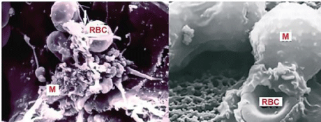 Figure 9: Death of RBCs in the bone marrow phagocytised by Macrophages (M) observed with SEM. RBCs death takes place mainly in the bone marrow, the same place where they have born.