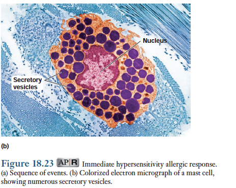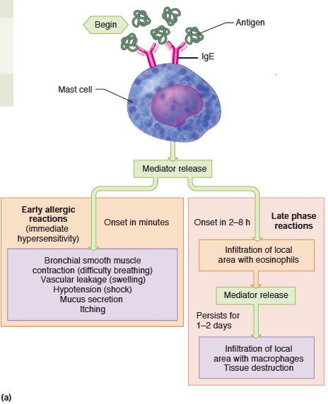 같은 형태의 항원이 체내로 들어가면 이들은 비만세포와 연결된 IgE와 결합하게 되며, 이것은 비만세포로 하여금 히스타만, 에이코노사이드, 케모카인 등과 같은 많은 염증매개체들을분비하게 함. 이러한 모든 매개체들은 국소적 염증반응을 일으킴. 비만세포에서 일어나는 이러한 일련의 과정은 또한 순환중인 호염기구에서도 일어남.