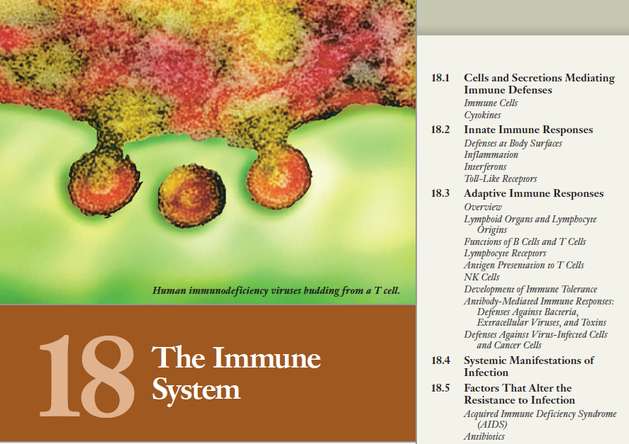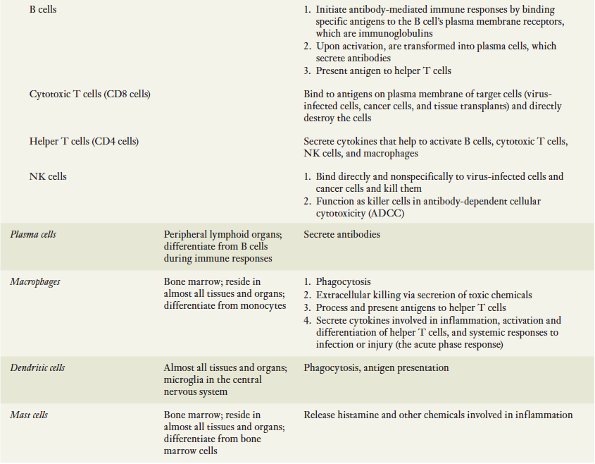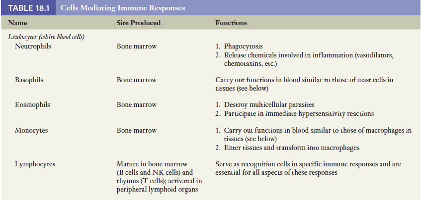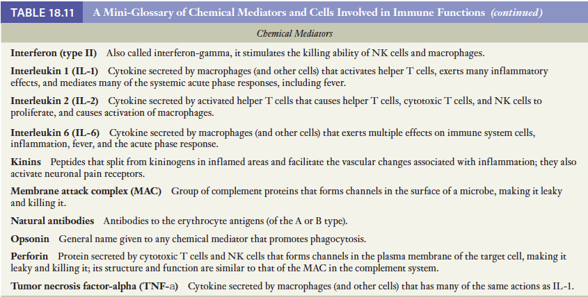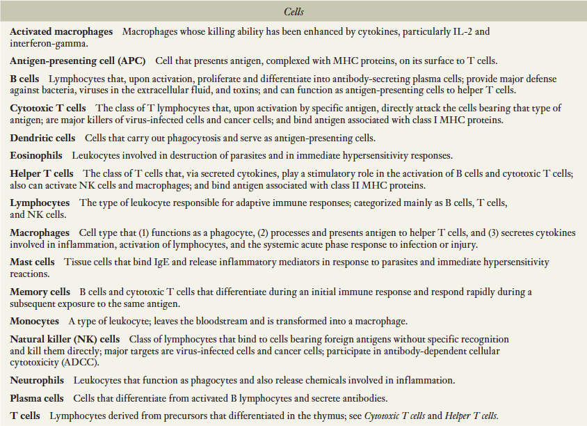 면역반응을 수행하는 세포들이 면역계를 구성함. 이들은 소화기계나 비뇨기계와 같이 뚜렷한 기관계를 형성하는 것이 아님. 대신 이들은 인체 전체에 퍼져있는 혈액과 림프액 그리고 각 조직에 존재하는 다양한 세포들의 집단임. 면역방어에 관여하는 세포의 수가 많고 또한 이들이 분비하는 화학전달자들이 더 많기 때문에 이들 세포들과 매개체들에 관한 간략한 용어해설을 표 18-2에 기술.