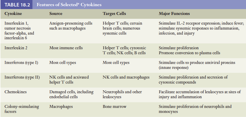 표참고. 이 장에서 몇몇 주요 시토카인들과 그들이 가장 중요한 기능들에 대해 논의함.