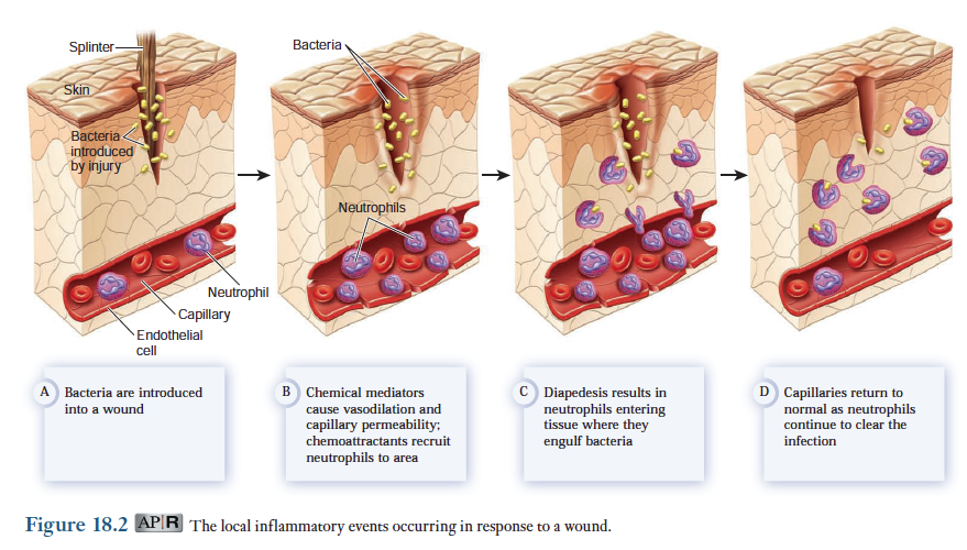 이절에서는 미생물의 침입에 의해 유발되는 선천성 면역반응인 염증에 관하여 설명하고자 함. 추위, 열 그리고 외상과 같은 여러 손상들에 의해 대부분 동일한 반응이 일어남. 나중에 언급하겠지만 염증반응은 많은 적응 면역반응을 수반하여 더욱 증폭됨. 표 18-3은 박테리아에 오염된 칼에 베었을때 야기되는 감염에 대한 전형적인 선천성 면역반응에서 일어나는 일련의 현상을 제시함.