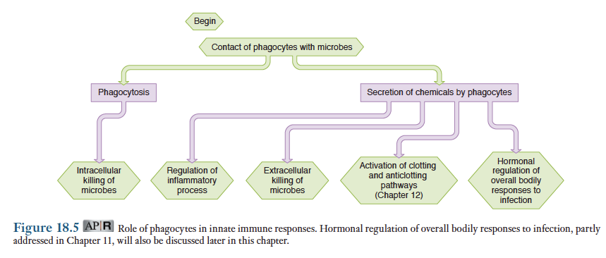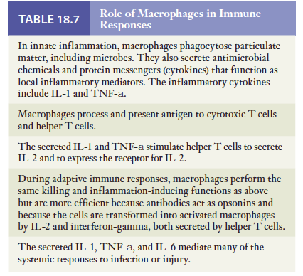 염증은 감염이나 상처에 대응하는 국소적인 신체 방어기구임. 염증의 기능은 외래 침입자를 파괴하거나 불활성화시키고 조직을 수선시킬 준비를 하는 것임. 이 과정에 관여하는 핵심 매개체는 식균작용의 기능을 하는 세포들임. 앞에서 언급했듯이 호중구, 대식세포, 그리고 수지상세포들이 가장 중요한 식세포들임.