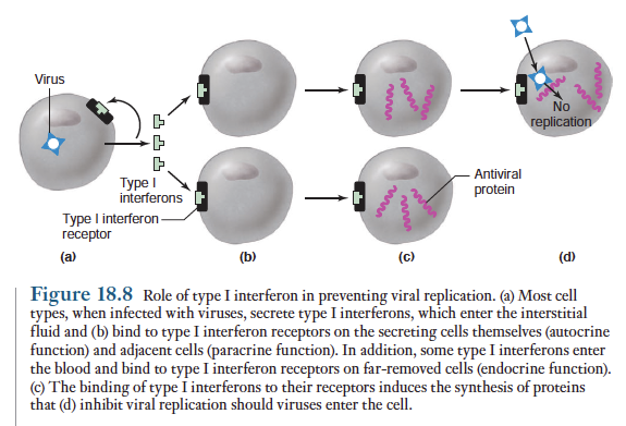인터페론은 시토카인의 한 종류로서 1형과 2형 두가지가 존재함. 1형 인터페론은 숙주내에 존재하는 바이러스의 증식을 비특이적으로 억제하는 몇가지 단백질들을 포함함. 대부분의 세포들은 바이러스 감염에 반응하여 이들 인터페론을 생산하여 세포외액으로 분비함. 이어서 방출된 1형 인터페론들은 그 분비세포와 바이러스에 감염여부와 관계없이 다른 세포의 세포막에 있는 수용체들에 결합함. 아래 그림.