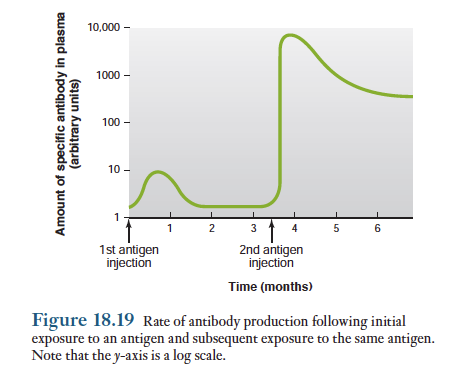 외래항원 침입에 대한 항체의 생성기구는 매우 다양한데, 특히 항체를 생성하는 기구는 이전에 그 항원에 노출되었는지의 여부에 따라 상당히 좌우됨. 항체의 생성은 첫번째로 항원에 노출된 후 서서히 증가하다가 동일한 항원을 다시 주사하면 즉각적으로 상당히 많은 양의 특이항체가 생성됨. 아래그림