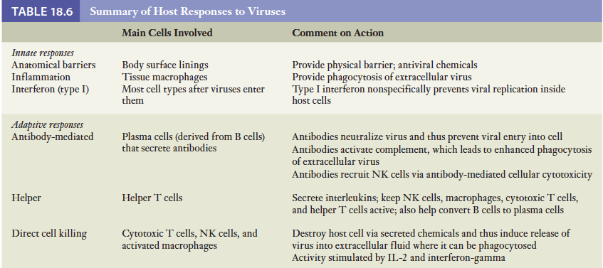 아래표는 이장에서 다룬 바이러스 침입에 대한 방어기전을 요약한 것임.