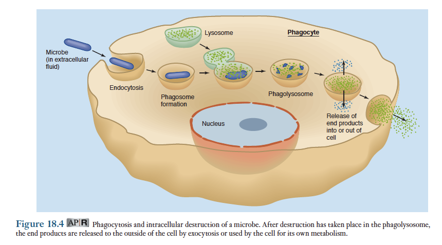 식세포가 미생물를 섭식할때, 식세포 안에서 미생물이 포함된 작은 주머니가 형성되는데 이것을 파고좀(phagosome)이라하며, 이는한층의 원형질막이 식세포의 세포질로부터 미생물을 분리시킨 것임. 파고좀 막은 이후 여러 가수분해 효소로 채워져 있는 식세포의 리소좀과 결합함. 파고좀과 리소좀막이 융합하여 파고리소좀이라 불리는 작은 소포를 형성. 파고리소좀 안에서 미생물의 거대분자는 리소좀에 있는 효소들에 의해 분해됨. 이회에도 파고리소좀 막에 있는 효소들은 과산화수소뿐 아니라 일산화질소 그리고 그밖의 산소유도체들을 생성시킴. 이러한 물질들은 미생물의 거대분자들에 강력한 파괴력을 가짐.