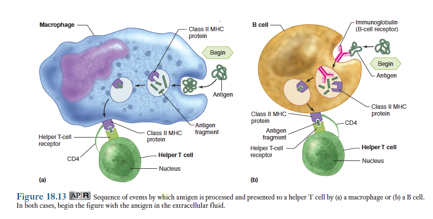 이런 경우 보조 T세포들이 어떻게 역할을 할 수 있는가? 위 그림이 이러한 기전을 가장 가깝게 설명하고 있음. 대식세포들이 세포외액에 있는 유리바이러스나 암세포 그리고 암세포의 표면에서 방출된 항원들을 식작용하고, 이 항원들을 공정처리하여 2형 MHC단백질들과 함께 결합시켜 보조 T세포에게 제시함. 이외에도 대식세포는 상호자극을 제공하고 또한 IL-1과 TNF-알파를 분비함. 활성화된 보조 T세포들은 IL-2와 다른 시토카인들을 분비하는데, IL-2는 자가분비물질로 작용하여 보조 T세포 자신의 세포증식을자극함.