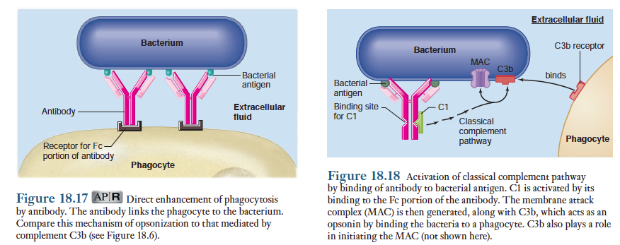 앞에서 언급하였듯이, 비특이적(선천성) 염증반응에서 혈장내 보체계는 대체적 보체경로(alternative complement pathway)를 통해 활성화됨. 반면 적응면역반응에서 IgG 혹은 IgM이 항원과 결합하여 고전적 보체경로를 통해 보체를 활성화시킴. 이 경로의 첫번째 분자인 C1은 항원과 결합한 항체의 Fc부위와 결합함. 그 결과 C1의 효소부분이 활성화되면서 고전적 보체경로(classical complement pathway) 전과정이 시작됨. 이 일련의 반응의 최종산물인 막공격복합체(MAC)는 항체가 결합된 상태에서 박테리아의 세포막을 파괴시켜 내용물을 유출되게 하여 세포를 죽임. 이외에도 그림에서 보았듯이 또 다른 활성화된 보체분자(C3b)는 옵소닌으로 작용하여 호중구와 대식세포에 의한 식균작용을 촉진시킴. 따라서 항체는 직접적으로도 그리고 보체 C3b의 활성화를 통해 식균작용을 촉진시킴.