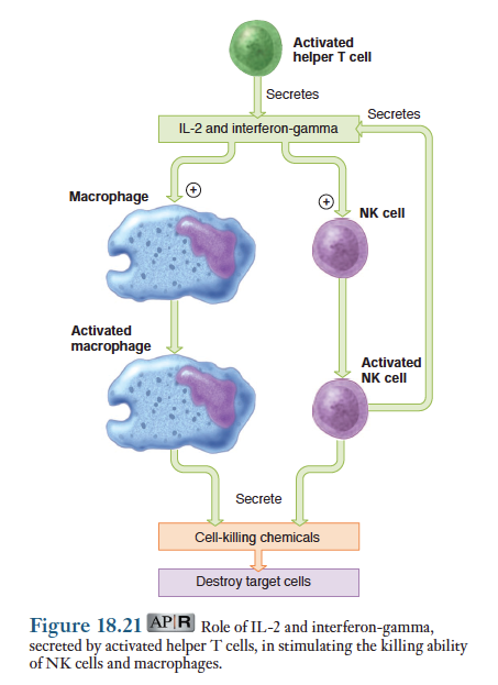 자연살생세포를 증식시키고 독성 화합물질을 분비시키게 하는 주된 신호는 표적세포들에 의해 특이적으로 활성화된 보조 T세포들에서 분비된 IL-2와 인터페론의 한종류인 감마-인터페론임. 그림. 모든 신체의 세포들은 다른 1형 인터페론을 생산할 수 있지만 감마-인터페론은 활성화된 보조 T세포와 NK세포만이 생산할 수 있음.