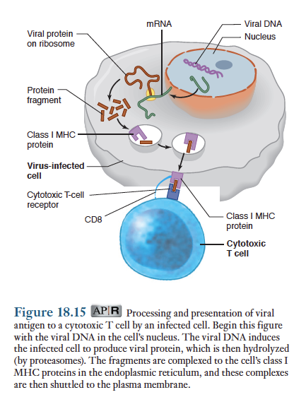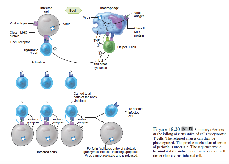 아래 그림은 바이러스에 감염된 신체의 세포에 의해 활성화된 전형적인 세포독성 T세포의 반응을 요약한 것. 암세포의 반응도 이와 유사함. 앞서 언급했듯이 바이러스에 감염된 세포나 암세포는 외래 단백질(foreign protein) 즉 내생적 항원(endogenous antigen)들을 생산하는데 이들은 공정처리되어 1형 MHC 단백질과 복합체를 형성하여 원형질막에 제시됨. 특정 항원에 특이성을 가진 세포독성 T세포는 B세포의 경우와 마찬가지로 이 복합체와 결합할 수 있지만 단지 항원과 결합하는 것만으로는 세포독성 T세포를 활성화시키지 못함. 활성화를 위해서 인접해 있는 활성화된 보조 T세포들에서 분비되는 시토카인이 필요함.