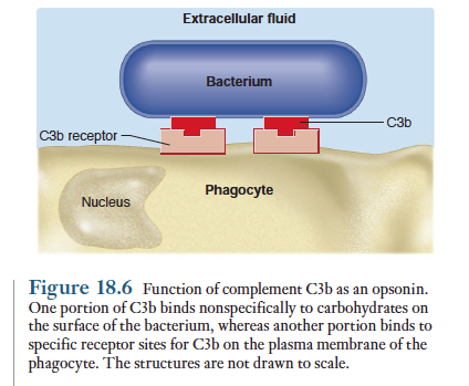 보체 활성화 경로에서 중심적 역할을 하는 단백질인 C3임. C3의 활성화는 일련의 과정을 일으키는데, 첫번째가 C3성분의 하나인 C3b 를 미생물 표면에 부착하는 것임. C3b는 옵소닌으로 작용하여 식세포를 미생물과 접촉시켜 파괴시키도록 함. 아래그림 참조