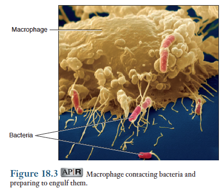 박테리아의 감염이 피부조직 바로 밑에서 일어났다는 가정하에 표 18-3에 언급한 각 단계를 차례로 살펴보기로 함. 만일 침입한 박테리아가 혈액이나 림프로 들어갔다면 다른 조직이나 기관에서도 비슷한 염증반응이 일어날 것임.