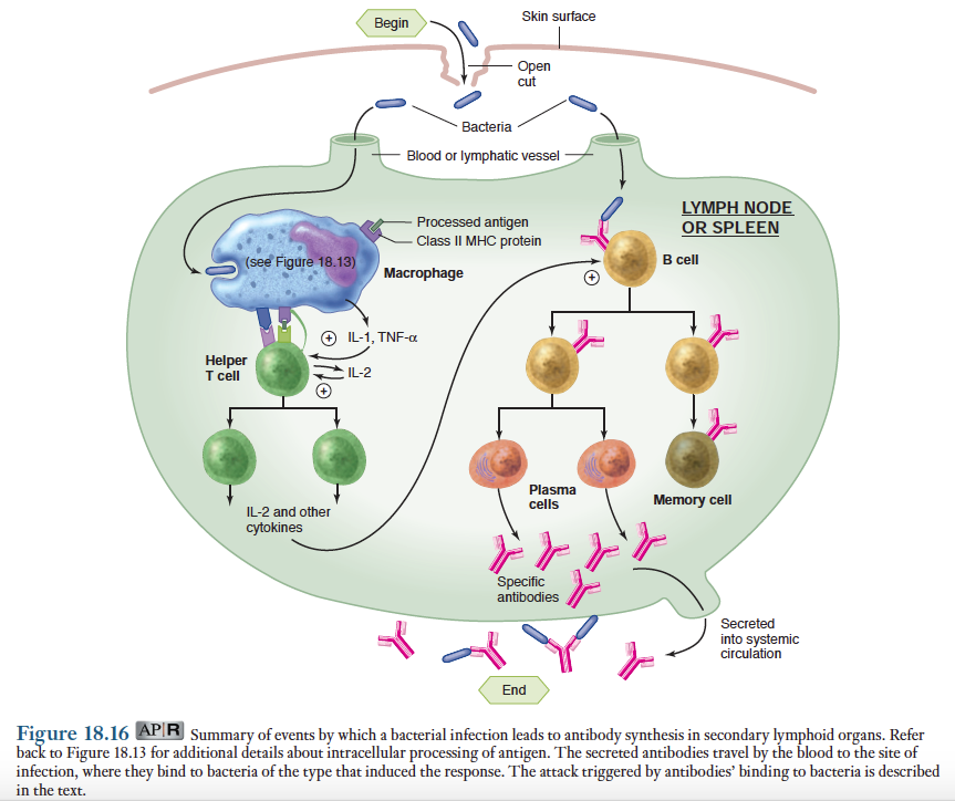 이제 우리는 박테리아의 감염에 대한 저항에 있어서 선천성 면역과 후천성면역 반응 사이의 상호작용을 요약할 수 있음. 생체가 처음으로 특정 박테리아와 접하게 되면 선천성 방어기전에 의해 그들의 침입을 막을 것이며, 만일 체내로 들어왔다 하더라도 식균작용과 염증과정으로 이들을 제거하는 시도가 있게 됨. 동시에 박테리아의 항원들은 특정 B세포 클론들을 항체 형성능력을 가진 형질세포들로 변환시킴.