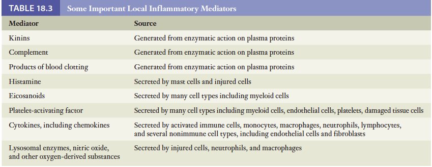 수많은 화학매개물질들이 염증에서 일어나는 일련의 현상을 유도하고 조절함. 아래 표 참조