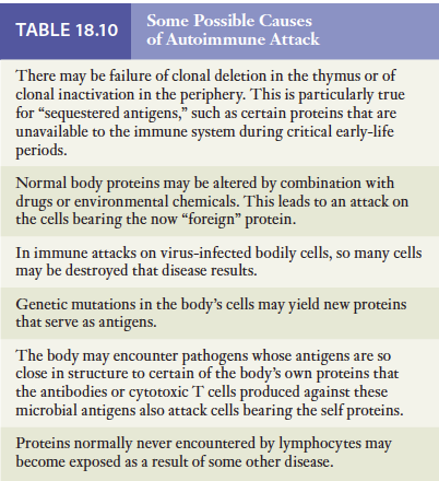 인간의 질병들 중 자가면역환으로 밝혀지는 경우가 점점 늘어나고 있음. 다발성 경화증은 신경세포의 수초가 공격을 당하며, 중증근무력증은 골격근 세포의 아세틸콜린 수용체가 표적이 되고, 류머티스 관절염은 관절이 손상되며, 1형 당뇨병은 췌장의 인슐린세포가 파괴됨. 인체가 자신의 세포를 자신의 것으로 인식하지 못하는 몇가지 원인을 아래 표에 요약함.