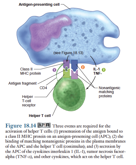 더욱이 대식세포가 보조 T세포활성화를 도와주는 방법은 이외에도 또 다른 두가지가 존재함. 1) 세포막에 있는 비항원성 단백질을통한 공동자극과 2)인터류킨 1과 TNF-알파 분비임. 공동자극은 보조 T세포를 자극하여 또 다른 시토카인인 인터루킨-2를 분비하게 함. 또 인터루킨 1과 TNF- DKF알파는 보조 T세포로 하여금 인터루키 2에 대한 더 많은 수용체를 발현하게 함. 인터루킨2는 이어서 자가분비 방식으로 활성화된 보조 T세포의 분열을 촉진함. 아래 그림.