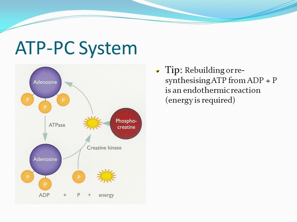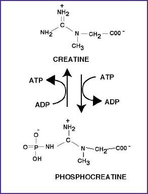 이러한 반응은 크레아틴 키나아제에 의해 촉진되며 ATP는 운동을 시작하자마자 ADP + Pi로 분해되나 PC화학작용으로 다시 ATP가 생성됨.