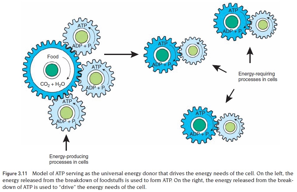 ATP는 종종 에너지 기증자로 불리며 움식물 분해에 따른 에너지와 결합하여 모든 세포에 필요한 에너지 형태로 전환시킴. 그림 3.11과 같이 세포에서 에너지 기증자로 묘사된 ATP 모델임. 세포는 음식물을 분해하는 에너지 생산반응을 이용하여 에너지 소비반응으로 ATP를 형성함. 이렇게 새롭게 형성된 ATP는 세포내에서 에너지가 필요한 반응을 유도하는데 사용됨. 그러므로 에너지 방출반응은 맞물린 2개의 바퀴처럼 에너지 소비반응에 연결되어 있음.