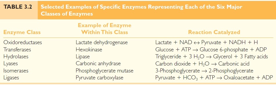 Ligases catalyze bond formation between two substrate molecules. ATP provides energy for these reactions. The names of many ligases include synthetase or carboxylase. Specific examples of each enzyme class as they relate to bioenergetics are contained in table 3.2.