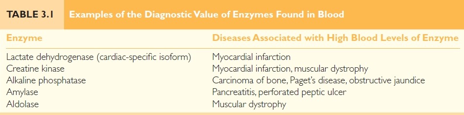 대부분 살아있는 세포의 효소들은 혈액으로 방출되지 않기때문에 혈액에서 발견할 수 있는 효소는 의학적 문제를 진단하는데 중요한 단서를 제공함.