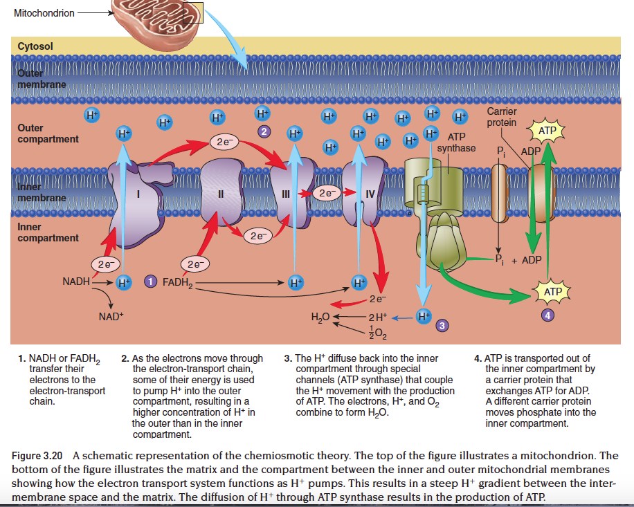 이러한 농도차는 H+를 기질안으로 다시 들여보내기 위한 강력한 확산작용을 일으킴. 그러나 미토콘드리아 내막은 H+ 불투과성이므로 호흡조합이라 불리는 특수한 H+통로를 통해서 안으로 들어갈 수 있으며 이러한 과정은 3.20 참조. H+가 이러한 통로를 통해서 미토콘드리아 내막을 통과할때 Pi가 ADP와 결합하여(인산화) ATP가 형성됨. 이것은 미토콘드리아 내막을 가로지르는 H+의 이동이 촉매반응을 책임지는 ATP 합성효소를 활성화시키기 때문임.