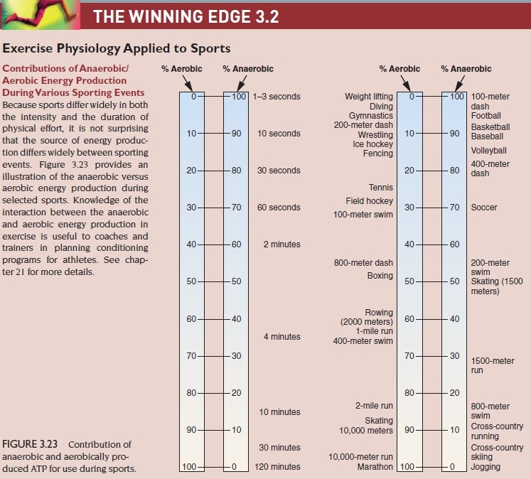 마라톤과 같은 운동은 필요한 에너지를 유산소성 ATP생산에 전적으로 의존함. 긇다면 2분-30분사이의 운동에 필요한 에너지는 어디에서 생산될까? 운동시간에 따른 무산소성과 유산소성 에너지 생산 비율의 평가는 경기력 향상비법 3.2에서 설명함.