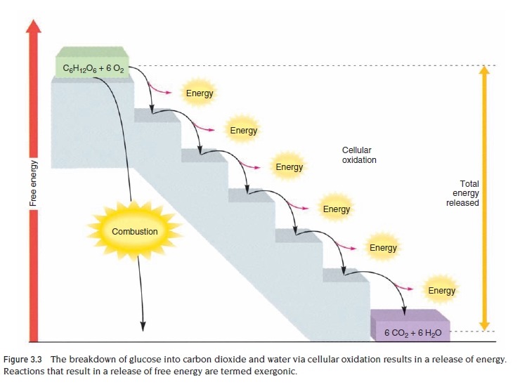 C6H12O6 포도당이 세포 산화반응에 의해 이산화탄소와 물로 분해되면서 에너지를 방출함. 자유에너지를 방출하는 반응을 에너지 생산반응(Exergonic reaction)이라고 함.