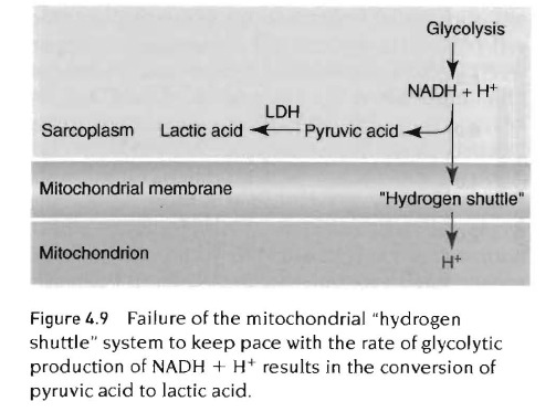 NADH Is “Shuttled” into Mitochondria NADH generated during glycolysis must be converted back to NAD if glycolysis is to continue. As discussed in the text, the conversion of NADH to NAD can occur by pyruvic acid accepting the hydrogens (forming lactic acid) or “shuttling” the hydrogens from NADH across the mitochondrial membrane. The “shuttling” of hydrogens across the mitochondrial membrane requires a specifi c transport system. Figure 4.9 (see Chapter 4) illustrates this process. This transport system is located within the mitochondrial membrane and transfers NADH-released hydrogens from the cytosol into the mitochondria where they can enter the electron transport chain. 해당작용을 지속하기 위해 NADH는 반드시 NAD+로 환원되어야 함. NADH가 NAD+로 전환되기 위해서는 피루브산이 수소이온을 받아들여서 젖산을 형성하거나 NADH의 수소이온이 미토콘드리아 세포막을 왕복해야 함. 수소이온이 미토콘드리아 세포막을 왕복하기 위해서는 특별한 수송체계가 필요함. 아래 그림참조. 이 전달체계는 미토콘드리아 막안에 있으며 NADH에서 유리된 수소이온을 미토콘드리아로 이동시켜 전자전달체계로 들어가게 함. 미토콘드리아에서 NADH+H+ 생성속도를 유지하기 위한 수소왕복 체계가 실패하면 그림과 같이 피루브산이 젖산으로 축적됨. |