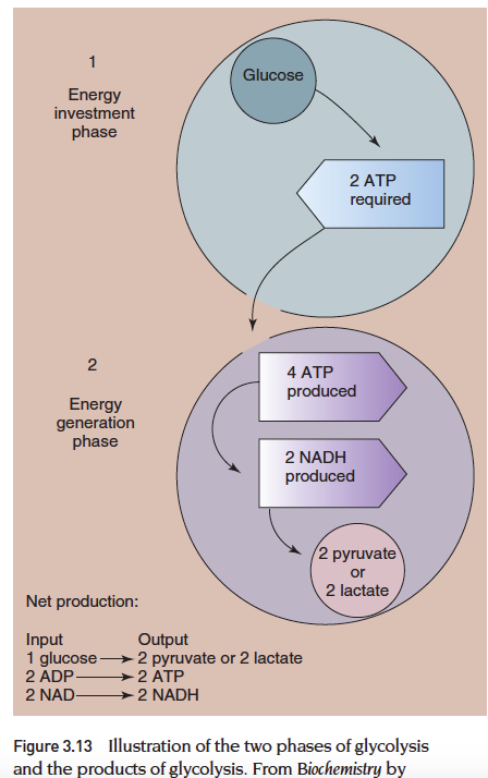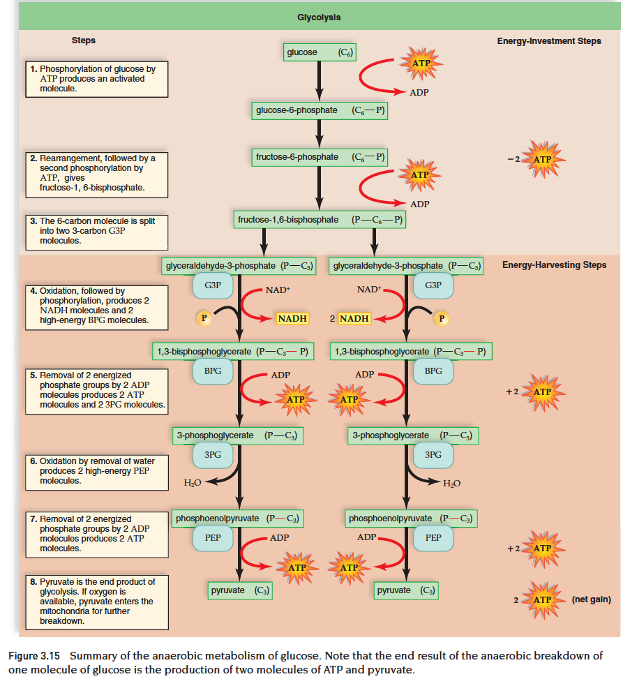 해당작용의 마지막 5가지 반응은 에너지 생성과정으로 그림 3.15는 각기 다른 2개의 반응으로 2개의 ATP를 생산하는 과정을 나타냄. 해당작용의 순수손익은 포도당을 연료로 사용하면 2개의 ATP 당원을 연료로 사용하면 3개의 ATP를 얻는다는 것임.