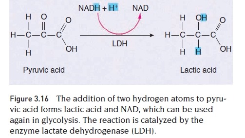 이러한 반응을 촉진하는 효소는 젖산 탈수소효소(LDH)로 젖산과 NAD+를 형성함. 그러므로 이러한 이유로 인해서 젖산염 형성은 NADH가 NAD+로 전환되어 해당작용을 유지할 수 있게 함.