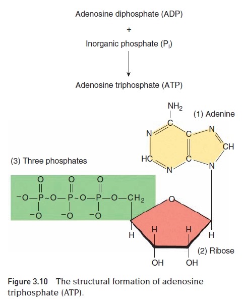 ATP는 세가지 중요한 부분 1) 아데닌 2) 리보오스 3) 3인산 부분으로 구성됨. ATP는 아데노신2인산과 무기인산 결합에 필요한 에너지로 형성되며 이 에너지의 일부분은 ATP와 Pi의 화학적 결합체에 저장되는데, 이를 고에너지 결합이라고 함. 효소 ATPase에 의해 결합체가 분해되면 에너지가 방출되어 근수축에 필요한 에너지원으로 사용됨.