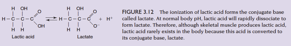 신체의 정상적인 pH에서는 젖산이 빠르게 분해되어 젖산염을 형성함. 그러므로 골격근이 젖산을 생성하지만 이는 복합염기인 젖산염으로 변환되기 때문에 신체내에서는 젖산형태로 존재하지 않음.