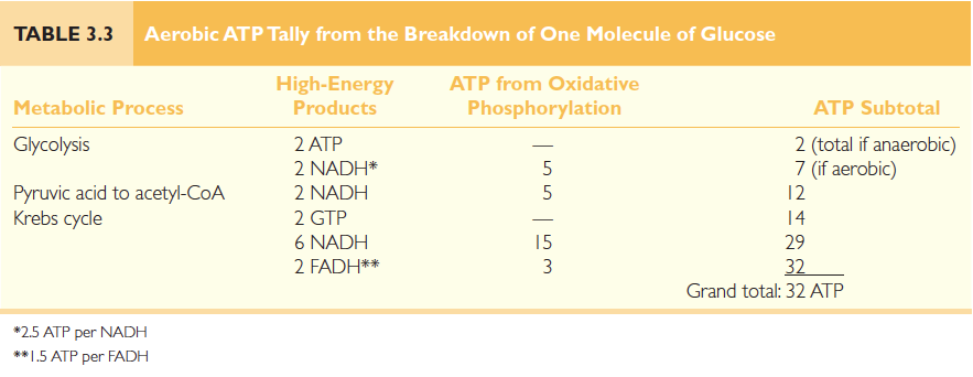크렙스 회로의 주요기능은 대사과정에 관여하는 여러종류의 기질로부터 수소이온을 제거하고 이 과정에서 발생한 에너지를 활용하는 것임. 한번의 크렙스 회로가 3개의 NADH분자와 1개의 FADH분자로 생성되는 과정을 3.18에서 소개함. 한쌍의 전자들이 전자전달체계를 통해서 NADH로부터 산소로 이동될때 2.5개의 ATP를 생성하는데 필요한 충분한 에너지가 만들어짐. 1개의 FADH분자가 형성되면 2개의 ATP분자를 형성할 수 있는 충분한 에너지가 만들어짐. 따라서 ATP를 생산하는 측면에서 NADH는 FADH보다 훨씬 더 효율적임.