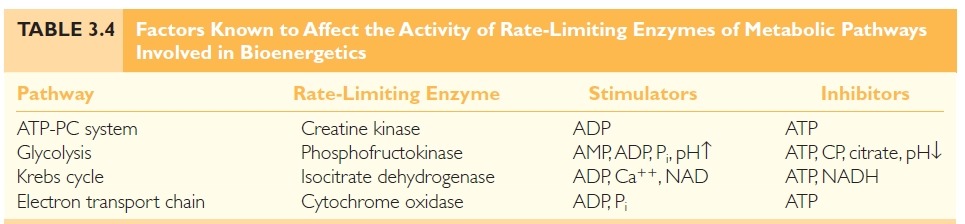 ATP를 생산하는 생화학적 체계는 매우 정교하며 정확한 시스템으로서 각각의 경로에는 특별한 효소에 의해 촉진되는 수많은 반응작용을 갖고 있음. 일반적으로 활용할 수 있는 기질이 있다면 효소에 의해서 화학적 반응속도를 빠르게 할 수 있음. 그러므로 화학적 체계에서 1개 또는 많은 효소를 조절한다는 것은 특별한 시스템의 비율을 조절한다는 의미임. 실제로 대사작용은 효소활동의 조절에 의해 통제되며, 대부분의 대사과정은 대사속도를 통제하는 역할을 하는 1개의 효소를 갖고 있음. 이러한 속도조절 역할을 하는 효소는 특정 대사과정의 속도를 결정함.