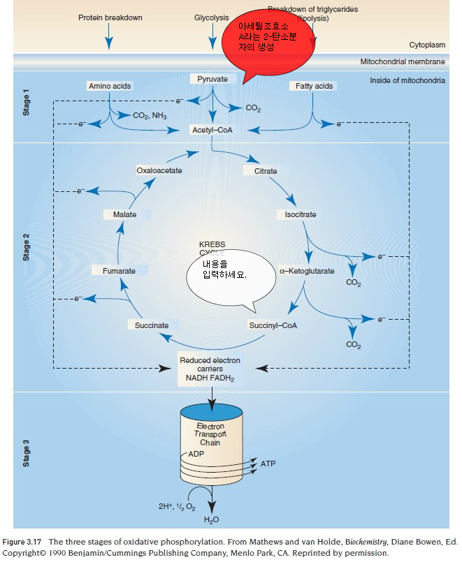 크렙스 회로는 시트르산 회로라고도 하며 이의 주요기능은 수소를 운반하는 NAD+와 FAD를 사용하여 탄수화물, 지방, 단백질의 수소이온을 제거하여 산화시키는 것임. 수소이온을 제거하는 과정이 중요한 이유는 수소이온이 전자를 갖고 있어서 음식물이 분해될때 잠재적 에너지를 낼 수 있기 때문임. 이 에너지는 전자전달체계를 이용하여 ADP+Pi와 결합하여 ATP를 생성함. 이와같이 유산소성 과정으로 ATP가 생성되는 과정을 산화적 인산화(oxidative phosphorylation)라 함. 유산소성 ATP를 생산하는 과정은 그림 3.17과 같이 3단계로 생각할 수 있음. 1단계는 아세틸 조효소 A라는 2-탄소분자의 생성, 2단계는 크렙스 회로내에서 아세틸조효소 A의 산화임. 3단계는 호흡체계인 전자전달체계와 산화적 인산화로 인한 ATP생성과정임.