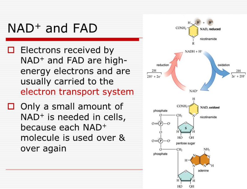 2개의 분자 즉 NAD와 FAD는 수소 또는 전자의 이동에서 중요한 역할을 함. NAD는 니아신(비타민 B3)에서 얻어지는 반면, FAD는 리보플라빈(비타민 B2)에서 나옴. NAD+는 산화된 형태이며, 환원된 형태는 NADH로 표기함. FAD는 산화된 형태이며, FADH는 환원된 형태임. 생체에너지 반응동안에 전달분자로서 NAD+와 FAD가 어떤 역할을 하는가에 대한 자세한 내용은 전자전달체계 장에서 설명.