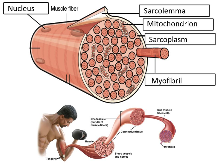 근세포에서는 근형질(sarcoplasm)이라 칭함. 세포질(cytoplasm)은 핵과 세포막 사이에 있는 세포의 액체부분임. 세포질 내에는 여러가지 세포기관이 있는데, 이들은 세포의 특별한 기능과 관계가 있음. 미토콘드리아와 같은 세포기관은 세포의 발전소라 불리며, 음식물을 유용한 세포에너지로 이용하기 위한 산화적 과정에 관계함. 세포질에는 해당작용을 위해 포도당분해를 조절하는 효소가 있음.