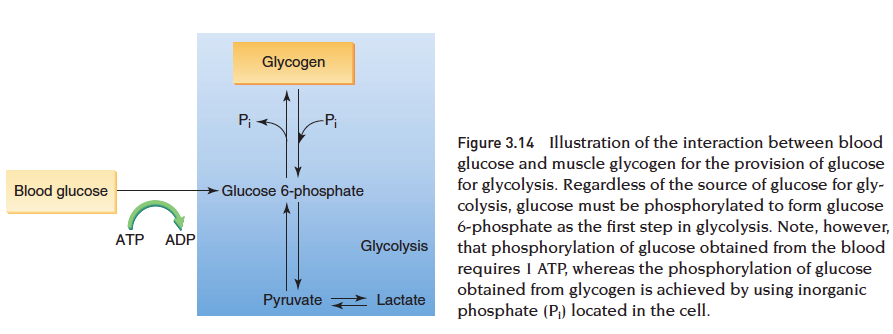 해당작용을 위한 연료인 포도당은 저장형태와 상관없이 반드시 인산화를 통하여 포도당 -6-인산으로 변환되어야 함. 특이사항은 혈액내에 있는 포도당은 1개의 ATP가 사용되지만, 당원에서 얻은 포도당의 인산화는 세포내에 있는 무기질 인산(Pi)를 사용하기 때문에 ATP가 필요없음.