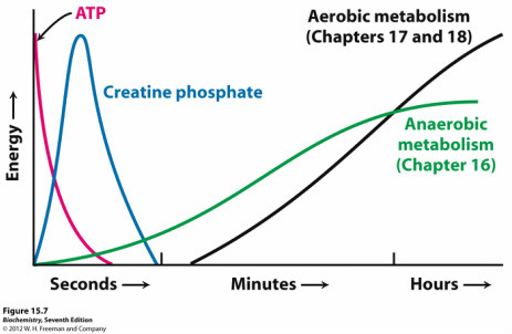 그렇지만 근육세포는 적은 양의 PC를 저장하기 때문에 이 반응으로 생산되는 ATP양은 제한적일 수밖에 없음. 저장된 ATP와 PC 결합을 ATP-PC 체계(ATP-PC system) 또는 인산체계(phosphagen system)이라 하며 5초 이내의 고강도 운동이나 운동을 시작할때 근수축에 필요한 에너지를 제공함. 오직 운동이 끝난 후 휴식기간에 사용한 PC를 다시 보충할 수 있으며 이때 ATP가 필요함.