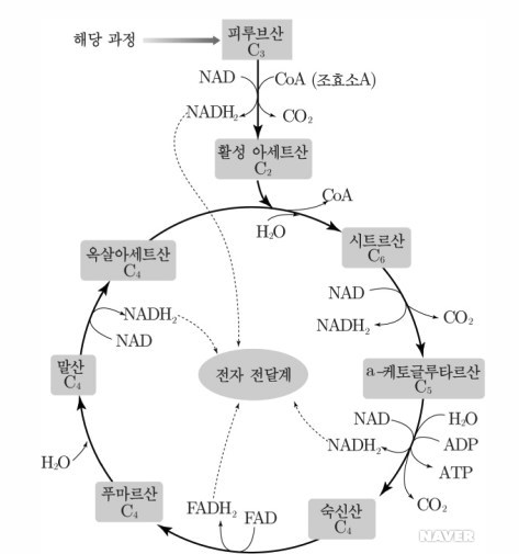 1분자의 피루브산이 TCA회로를 거치는 동안 1ATP와 3분자의 이산화탄소가 생성된다. 피루브산이 가지고 있던 H는 탈수소 효소에 의해 NAD와 FAD에 결합되어 4NADH2와 1FADH2를 생성한다. 4NADH2와 1FADH2는 전자 전달계로 들어가 산화되어 ATP를 생성한다.