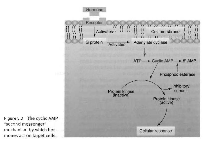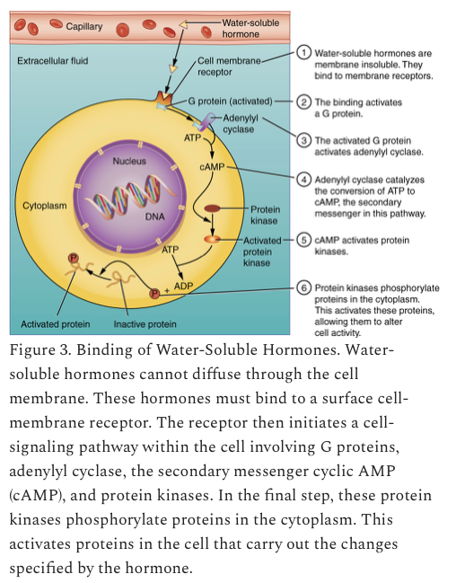 많은 호르몬들이 그 크기와 복잡한 구조때문에 세포막을 통과하기 힘듬. 이 호르몬들이 막 표면위에서 수용기와 결합하여 효과를 발휘하고 세포막 내부에 위치한 G단백질을 활성화시킴. G단백질은 막 표면위의 호르몬-수용기 상호작용과 뒤이은 세포내부의 변화 간의 연결고리임. G단백질은 세포안으로 Ca2+ 유입을 허용하는 이온채널을 open함. 즉 막 내부의 효소를 활성화하도록 함. 만일 G단백질이 아데닐산염 시클라제를 활성화시키면 순환성 AMP가 ATP로부터 형성됨. 이어서 순환성 AMP농도는 세포안에서 증가하고 단백질을 활성화시켜 세포활성화를 직접 변환시킴.