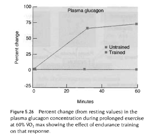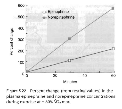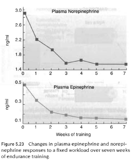 그림 5.23은 지구성 훈련이 일정기간의 운동에서 혈장 에피네프린, 노르에피네프린의 아주 빠른 감소를유발하는 것을 보여줌. 3주 이내에 이런 변화가 나타남. 지구력 훈련으로 E와 NE이 이렇게 빠르게 감소하는 것은 포도당 동원의 감소와 함게 일어남. 이런 사실에도 불구하고 혈장 포도당 농도가 유지되는데 이는 근육에 대한 포도당 흡수가 감소하기 때문임.