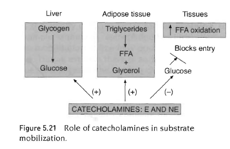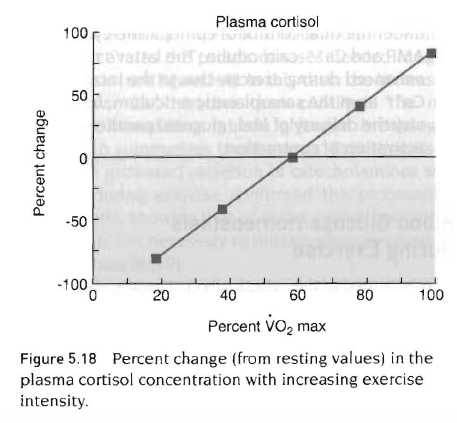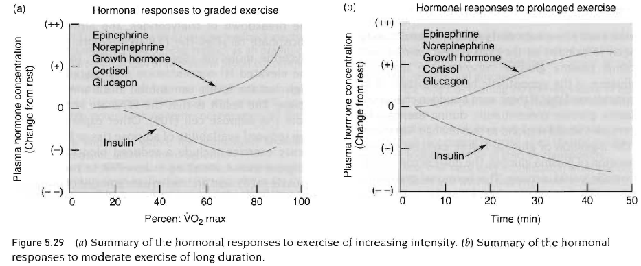 강한 운동중에는 혈장 글루카곤, 성장호르몬, 코티졸, 에피네프린, 노르에피네프린이 증가하고 인슐린은감소함. 이들 호르몬의 변화는 탄수화물을 보존하고, 혈장 포도당 농도를 유지하는 것을 돕기 위해 지방조직으로부터의 유리지방산의 동원을 조력함.
