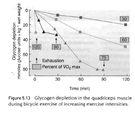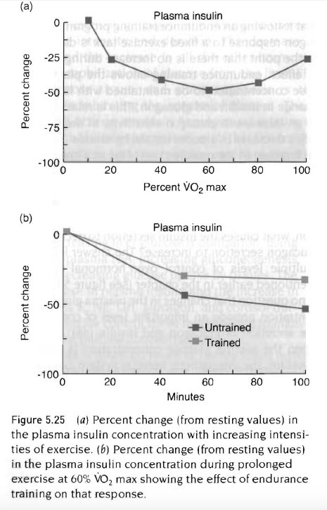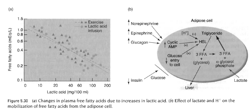 따라서 유리지방산은 지방세포로부터 방출되지 않고, 혈장 수준이 떨어지며 근육은 연료로서 더 많은 탄수화물을 이용해야 함. 지구성 훈련의 효과중 하나는 어떤 고정된 부하에서 젖산 농도가 감소한다는 것임. 이와같은 변화는 지방조직으로부터 유리지방산 동원의 억제가 감소할 것이고, 훈련된 사람이 더 많은 지방을 연료로 이용하게 할 것임.