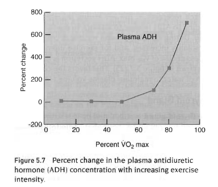 VO2max 60%에서 항이뇨 호르몬 분비율이 높아짐.