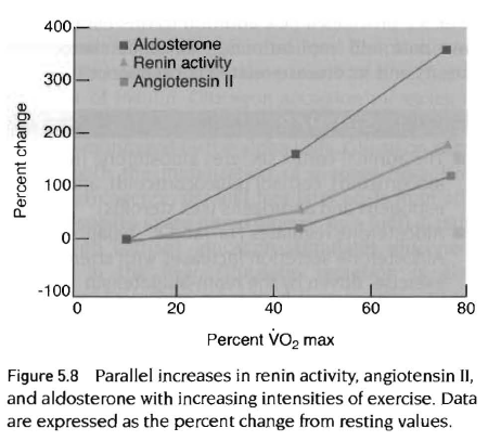VO2max 50% 에 근접하면 레닌, 안지오텐신, 알도스테론이 비례하여 증가함.