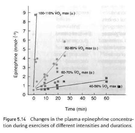 아래 그림은 혈장 에피네프린이 운동강도의 증가에 따라 얼마나 빨리 증가하는지를 나타냄. 운동중 혈장 에피네프린의 변화와 당원분해 증가율간에 연관이 있는 것으로 보여짐.