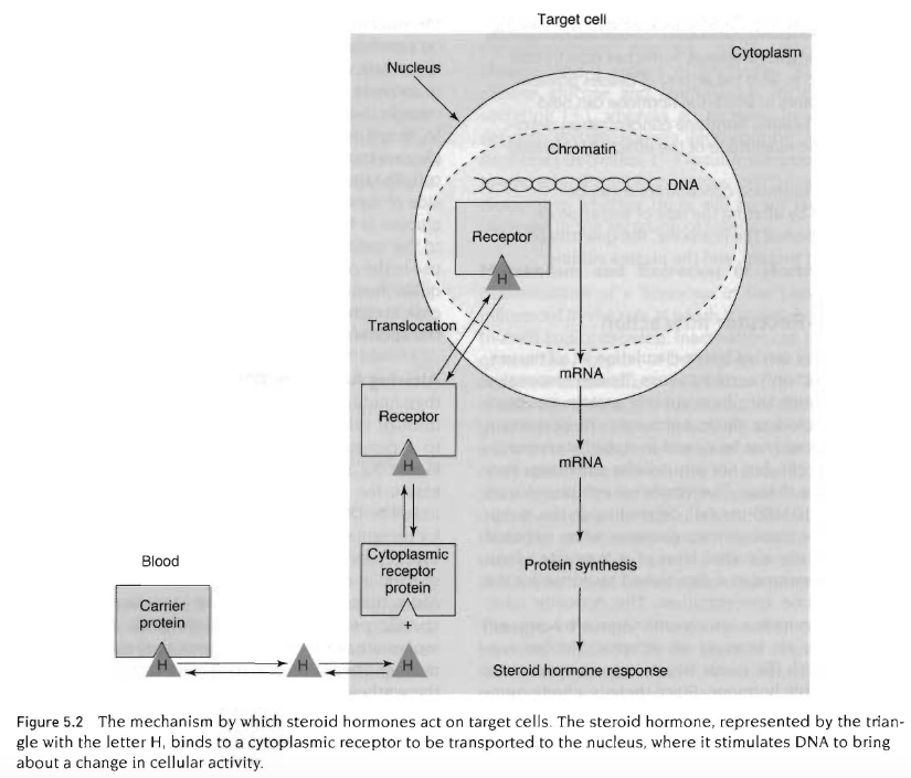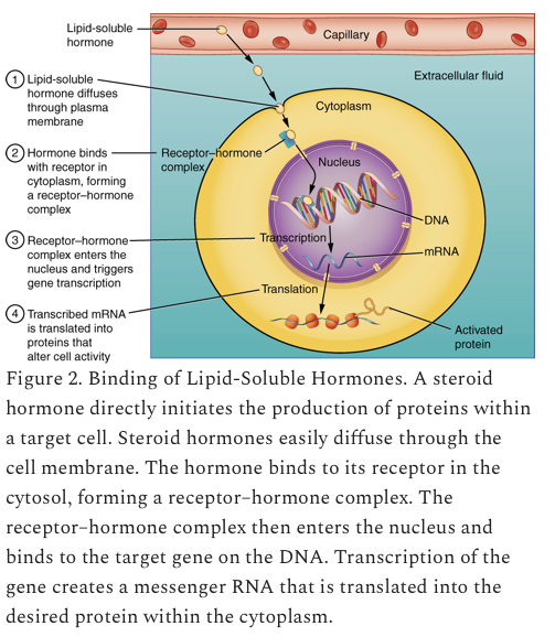 이 처럼 지용성 호르몬은 효과가 발현되기 까지 시간이 소요된다는 특성이 있지만, 반대로 쉽게 분해되지도 않기 때문에 일단 발현되고 나면 그 효과가 상대적으로 오래 지속됨.